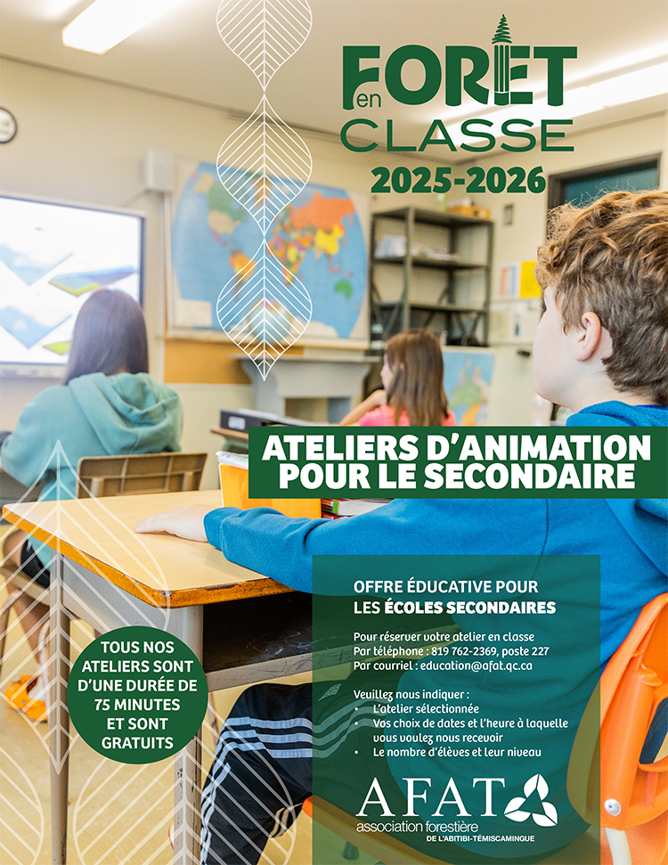 D’octobre à avril, l’AFAT offre aux écoles primaires de l’Abitibi-Témiscamingue et du Nord-du-Québec l’opportunité de recevoir notre équipe d’animation pour un atelier éducatif en lien avec la forêt et ce qui l’entoure. Nous nous déplacerons dans votre école afin de partager notre passion avec vos élèves !